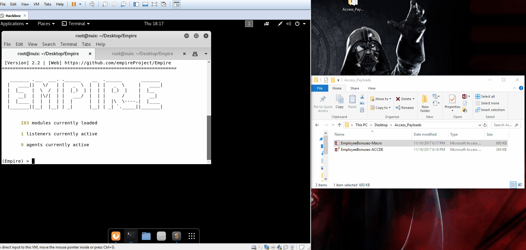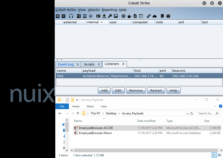 This gave me two copies of the same file: A regular database file format and an “execute only” version of the same database. Both are loaded with the autoexec macro that triggers my VBScript, providing me with access to the target host. Here’s how the payloads look in action.