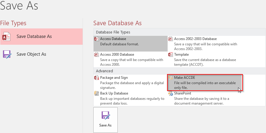 To create the executable file, I saved the payload as a standard database file. Then, I navigated to the “Save As” menu option and selected “Make ACCDE.” This saved the database as a “locked-down” version of the original.