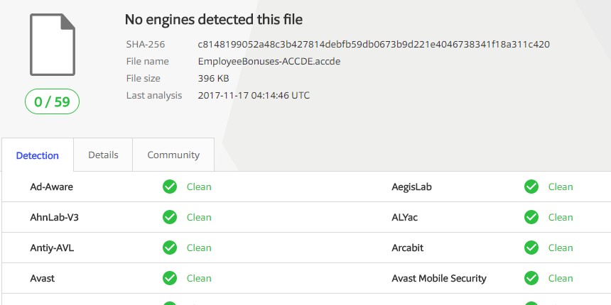 When I uploaded the ACCDE format to virustotal.com, it received a perfect score.