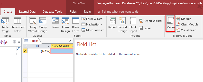 With my blank database open, I navigated to the “Create” tab and select “module” button next to the Macro button group.